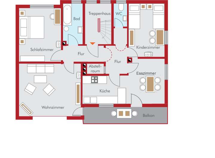 - G ca. 83 m²: Wohn- und Schlafzimmer, Küche mit Essbereich, Kinderzimmer, Bad, WC und Balkon