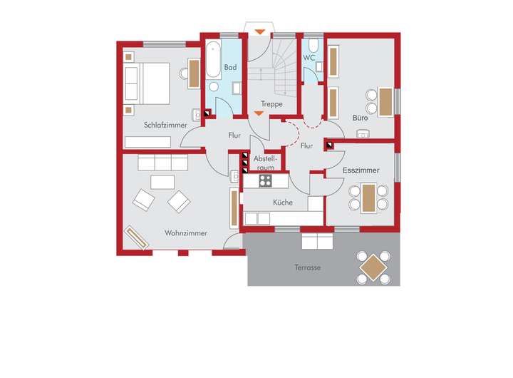 - EG ca. 83 m²: Wohn- und Schlafzimmer, Küche, Esszimmer, Büro, Bad, WC und Terrasse