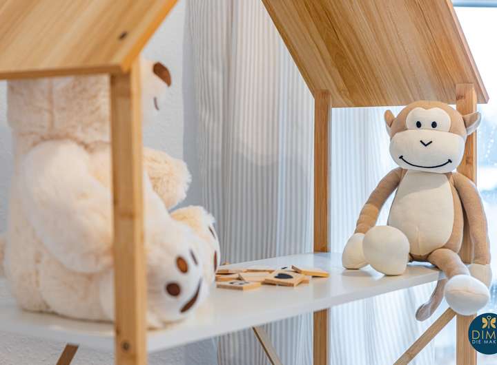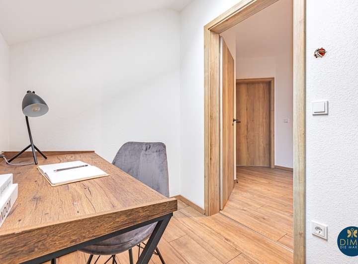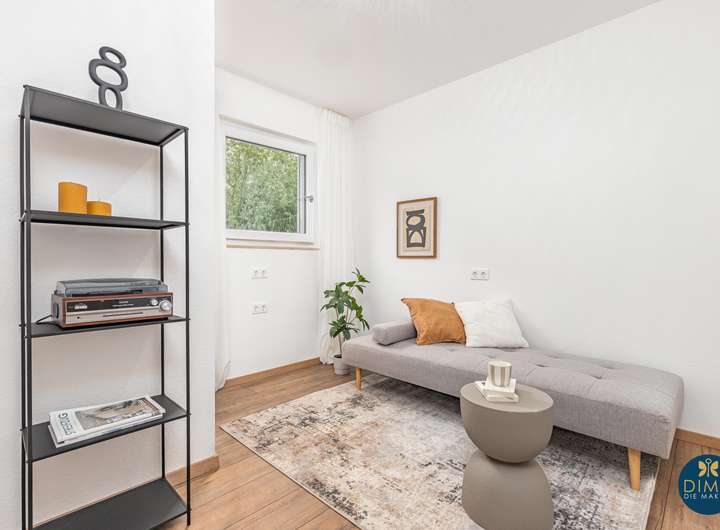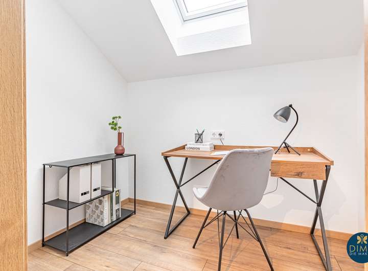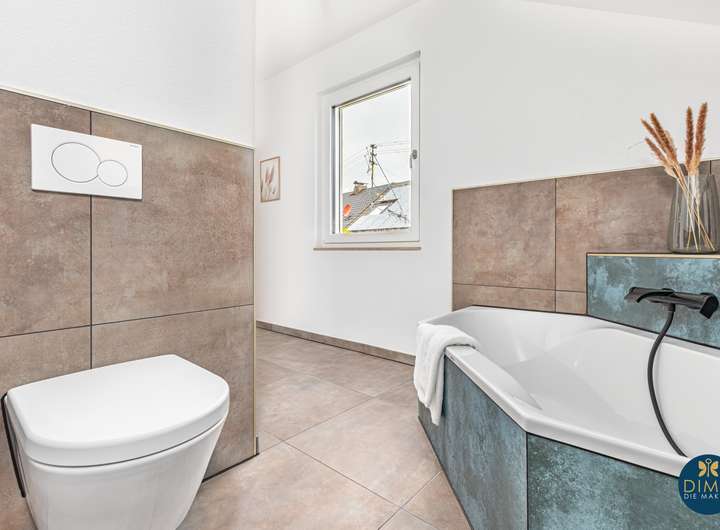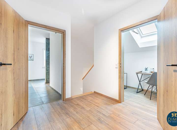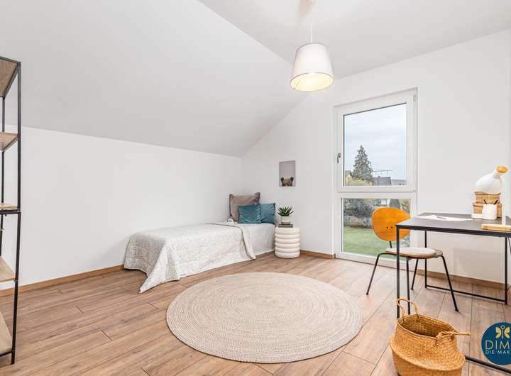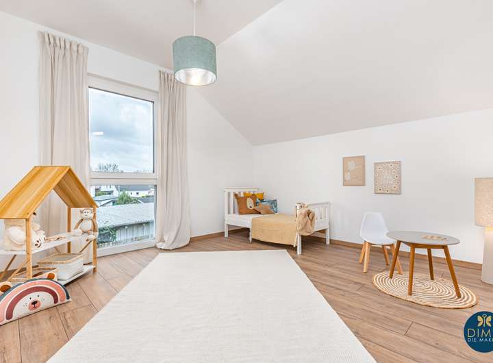 Im Obergeschoss befinden sich zwei helle, nahezu gleich große Kinderzimmer, die viel Raum zum Spielen, Lernen und Entspannen bieten. Das Elternschlafzimmer verfügt über ein begehbares Ankleidezimmer, das zusätzlichen Komfort schafft. Ein kleines Büro bietet Platz für konzentriertes Arbeiten oder ruhige Rückzugszeiten. Das moderne Familienbad ist mit einer Eckbadewanne, einer bodengleichen Dusche, einem Doppelwaschtisch und einem WC ausgestattet.