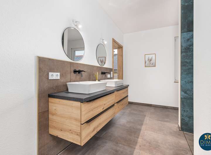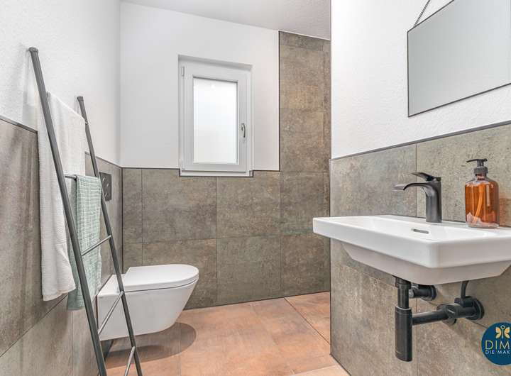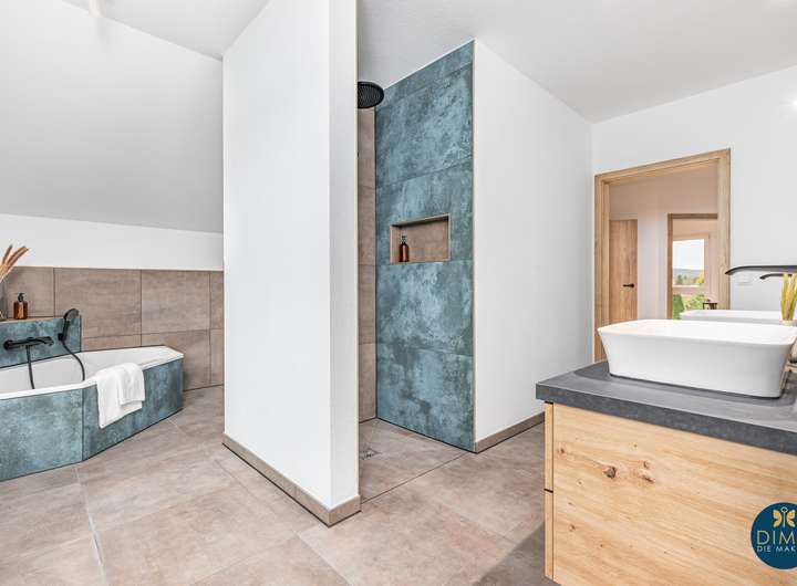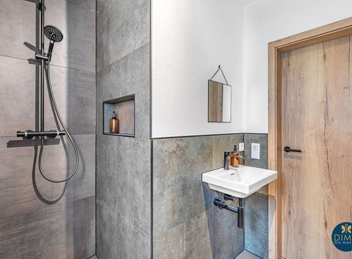 - Badezimmer mit bodengleicher Dusche, Waschtisch und WC im EG