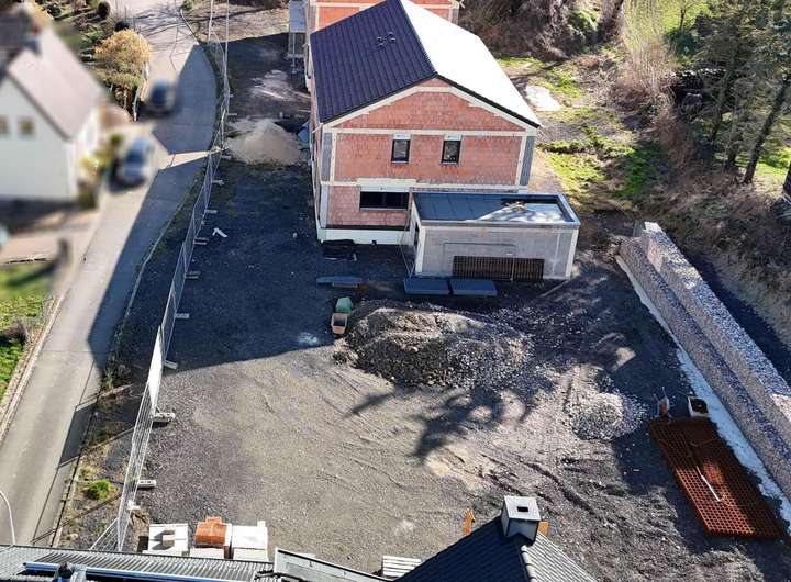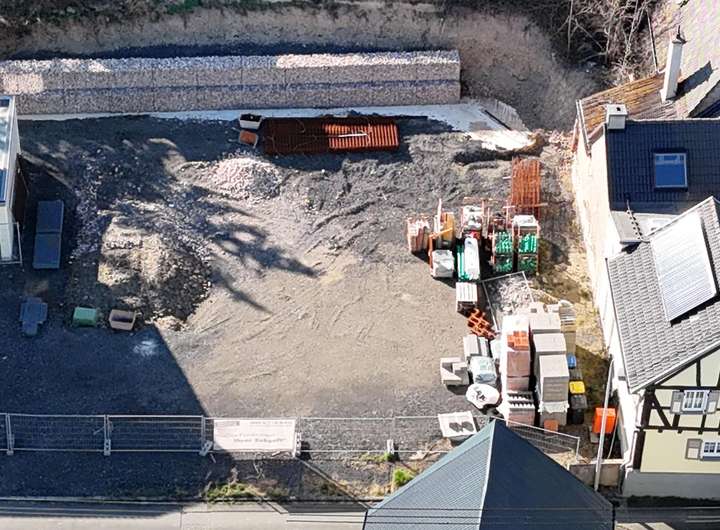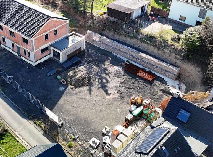 Der Gartenbereich ist zur Westseite hin gelegen und bereits mit einer Gabionenwand auf der Grenze versehen. Die Straßenfront liegt bei ca. 24 m und die Tiefe bei ca. 29 m.