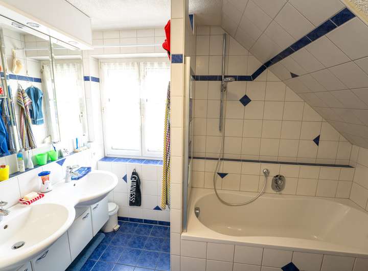 In der im Dachgeschoss beherbergten ca. 85 qm großen 5-Zimmer-Wohnung befindet sich ein schönes Wohnzimmer mit Zugang zum Balkon, vier Zimmer und ein modernes Badezimmer mit Doppelwaschbecken und einer Badewanne, ein separates WC, sowie die Küche mit angrenzendem Vorratsraum.