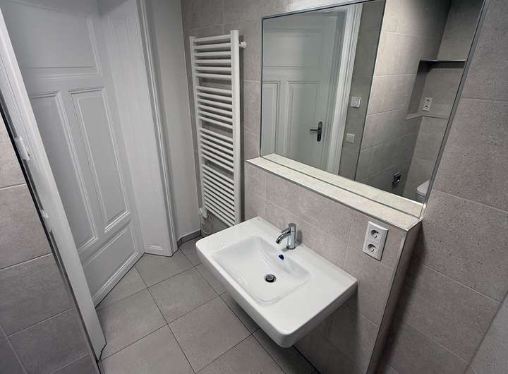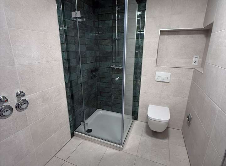 Das hell geflieste Bad ist mit einer ebenerdigen Dusche ausgestattet und bietet ein klares, zeitloses Design. Hochwertige Armaturen und eine moderne Sanitärkeramik sorgen für ein gepflegtes Ambiente.