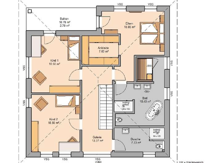 Im Obergeschoss verfügen die beiden Kinderzimmer über ein eigenes Duschbad. Die Eltern wiederum haben ihren eigenen Rückzugsort mit Ankleide und großzügigem Wellnessbadezimmer mit bodengleicher Dusche, frei stehender Badewanne sowie auf Sonderwunsch einer Sauna. Hier werden Wohnträume wahr!