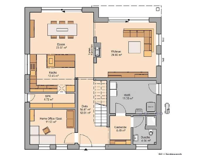 Die Stadtvilla Pallas ist ein wahr gewordener Wohntraum der Moderne. Auf zwei Geschossen finden Sie insgesamt 5 lichtdurchflutete Räume, die dem hohen Anspruch an maximalen Wohnkomfort gerecht werden. Eines der Highlights im Erdgeschoss ist der offene Wohn- und Essbereich, der mit einem Tunnelkamin optisch voneinander getrennt werden kann. Die Küche bietet Platz für eine schöne Kochinsel, die vor allem die Herzen von Hobby-Köchen höher schlagen lässt. Der Eingang zur Speisekammer wird modern als Teil der Küchenfront integriert. Das Erdgeschoss wird komplettiert durch ein Home-Office, ein Duschbad sowie den Hauswirtschaftsraum.