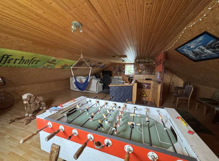 Das Dachgeschoss bietet zusätzliches Potenzial: Ob als Ausbaureserve, Hobbyraum, oder als Loft – hier sind Ihren Wünschen keine Grenzen gesetzt. Der derzeitige Partyraum lädt zu geselligen Abenden mit Freunden ein und lässt Raum für kreative Nutzungen.