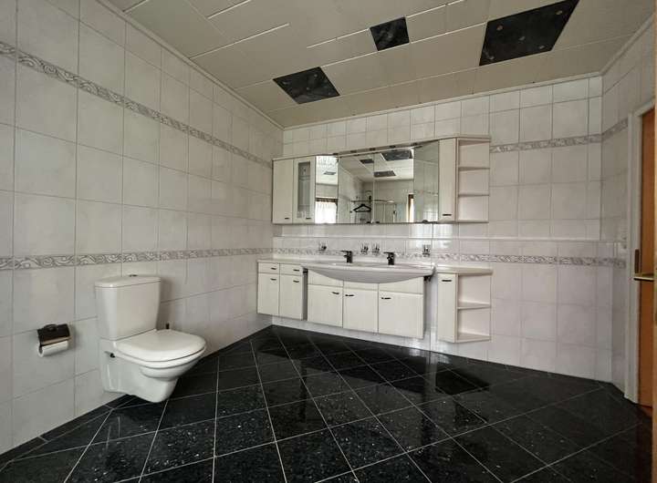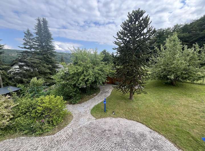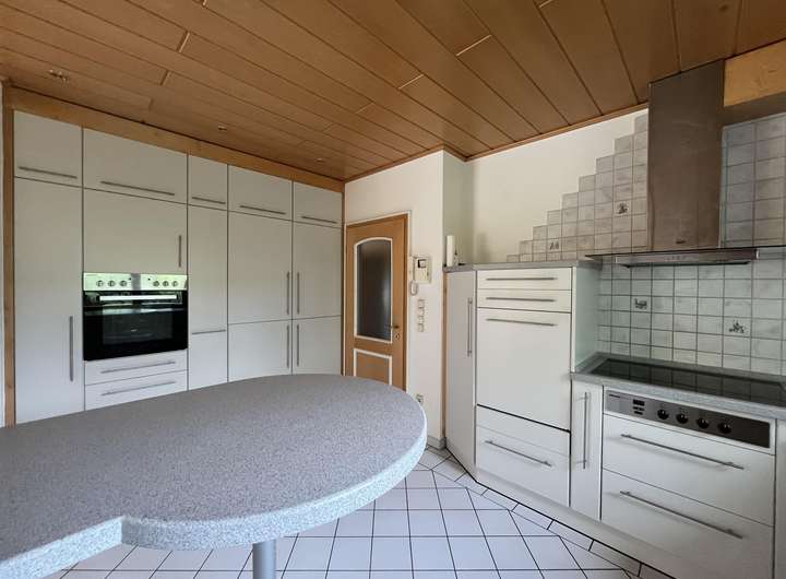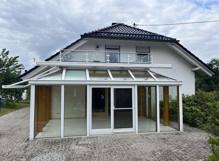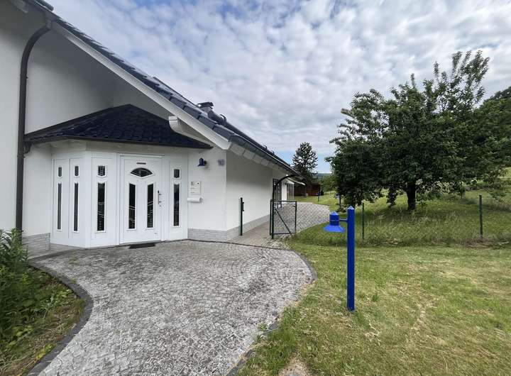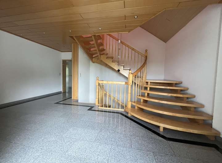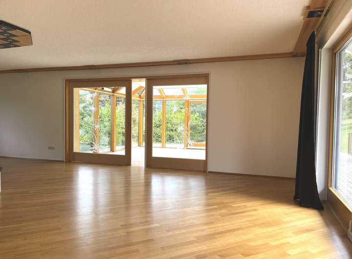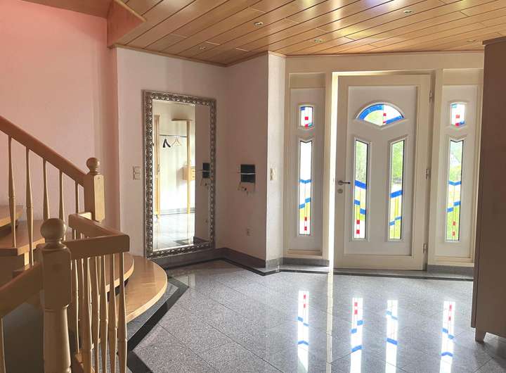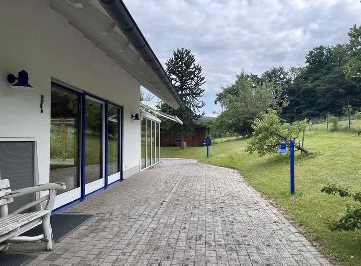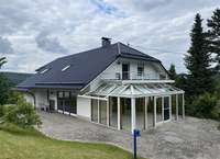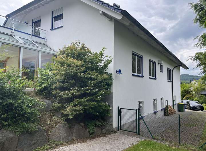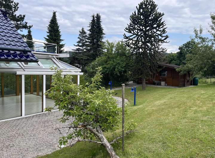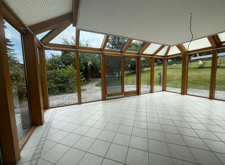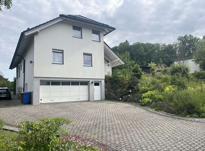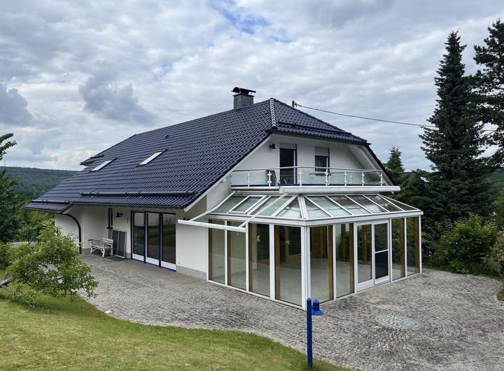 Im Kundenauftrag vermarkten wir eine außergewöhnliche Immobilie mit sonnigem Grundstück in einer ruhigen Seitenstraße von Niederdresselndorf. Die Wohnfläche von ca. 289 m² verteilt sich über Erd- und Dachgeschoss. In der großzügigen Eingangsdiele befindet sich die geschmackvolle Massivholztreppe, die das Kellergeschoss mit dem Dachgeschoss verbindet. Durch eine separate Tür gelangen Sie in das Erdgeschoss. Hier erwarten Sie ein großzügiges, lichtdurchflutetes Wohn/Esszimmer mit angrenzendem großen Wintergarten mit herrlichem Blick ins Grundstück sowie Zugang zur umlaufenden Terrasse mit Süd-West-Ausrichtung. Der geschmackvolle gemauerte Kaminofen verbreitet eine behagliche Atmosphäre. Außerdem stehen Ihnen eine Küche, ein separater Abstellraum, ein Gäste-WC, ein Schlafzimmer mit angrenzendem Ankleidezimmer sowie ein Badezimmer zur Verfügung. Über die Treppe gelangen Sie ins Dachgeschoss, das ebenfalls über eine Eingangstür verfügt. Hier erwarten Sie ein großzügiges Gästezimmer mit Wohnbereich und Zugang zum Balkon sowie zwei weitere Schlafräume und ein Badezimmer. Im Kellergeschoss steht Ihnen neben diversen Kellerräumen noch ein Gäste-WC zur Verfügung. In einem der Kellerräume befindet sich die Feuerung für den Kaminofen im Wohn/Esszimmer, so dass im Wohnbereich kein Staub oder Dreck durch die Nutzung entstehen. Außerdem gelangen Sie vom Kellergeschoss in die großzügige Doppelgarage. Das großzügige, komplett eingezäunte Grundstück ist geschmackvoll angelegt und verfügt neben einem Gartenhaus über eine große umlaufende Terrasse mit Süd-West-Ausrichtung, die Sie sowohl vom Wohnzimmer als auch vom Wintergarten aus erreichen können.