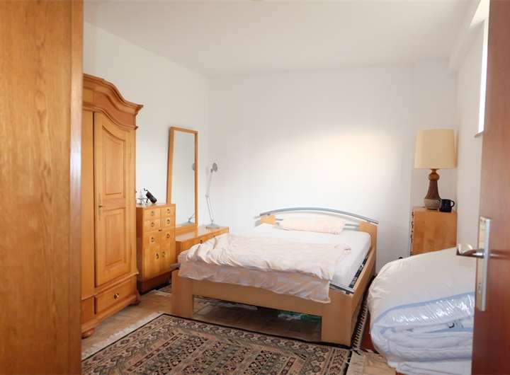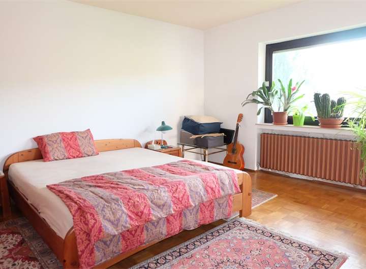 Direkt nebenan befindet sich das stilvolle Schlafzimmer mit edlem Parkettboden. Es ist ein Ort der Ruhe und Geborgenheit. Das moderne und großzügige Badezimmer befindet sich direkt neben dem Schlafzimmer und wurde 2021 modernisiert.