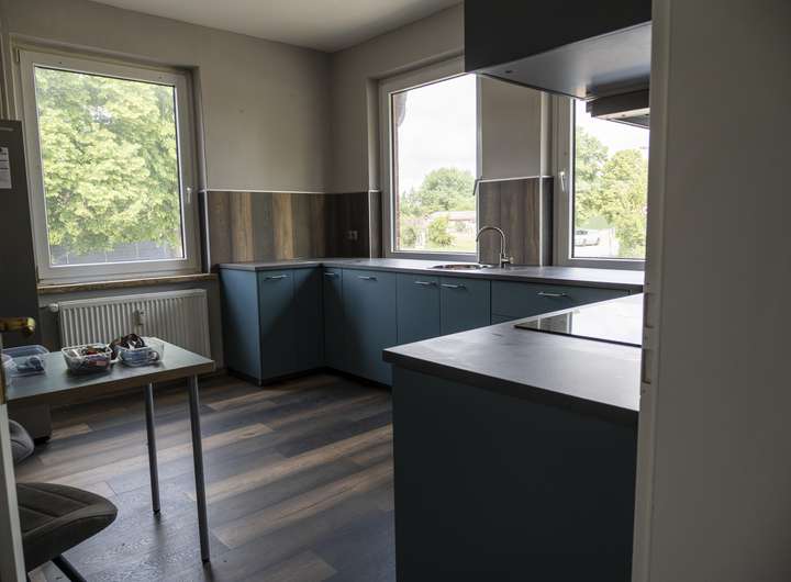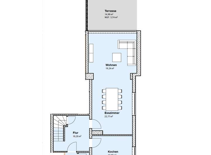 Das Erdgeschoss verfügt über eine geräumige Einbauküche, einen großen Wohn-/Essbereich mit Terrassenzugang sowie ein Gäste-WC.