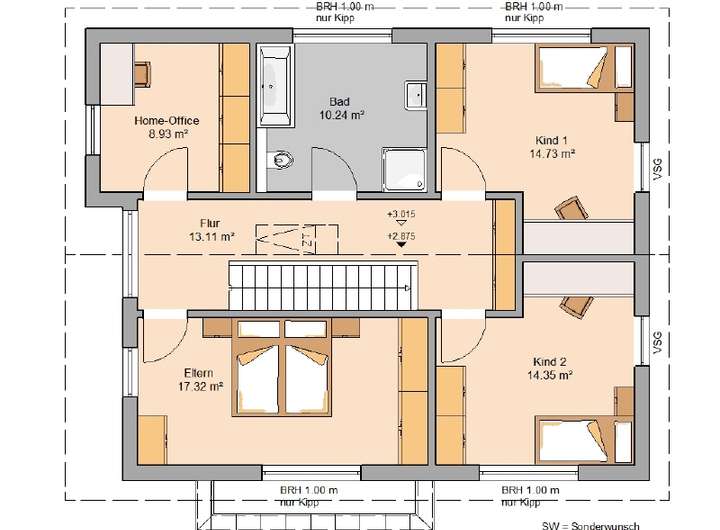 Dort finden sich zwei fast gleich große Kinderzimmer, ein Eltern-Schlafzimmer, ein Badezimmer und ein Home-Office, das auch als Gästezimmer genutzt werden kann. Alle Zimmer verfügen über bodentiefe Fenster, die für ausreichend Helligkeit sorgen. Modern sind auch die Fenster im Drempelbereich und die mögliche Fassadengestaltung durch farbige Putzflächen.