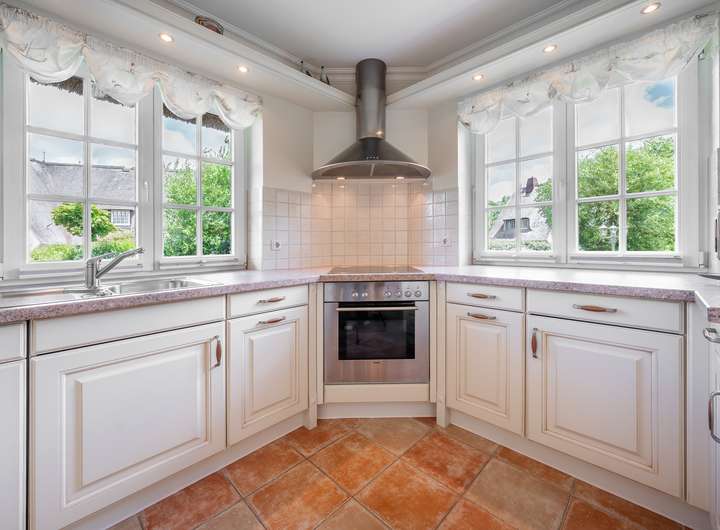 Die Einbauküche ist mit Siemens-Markengeräten ausgestattet und bietet gleich zu zwei Seiten einen tollen Ausblick.
