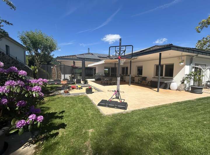 Die sehr große und teilweise überdachte Terrasse ist von mehreren Zimmern begehbar und lädt sowohl nach Feierabend als auch an Wochenenden zum gemütlichen Verweilen ein.