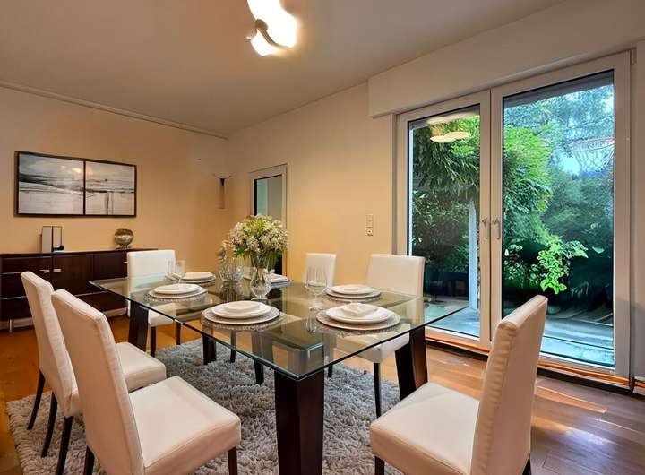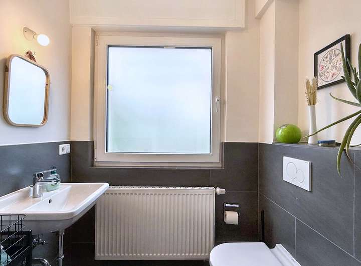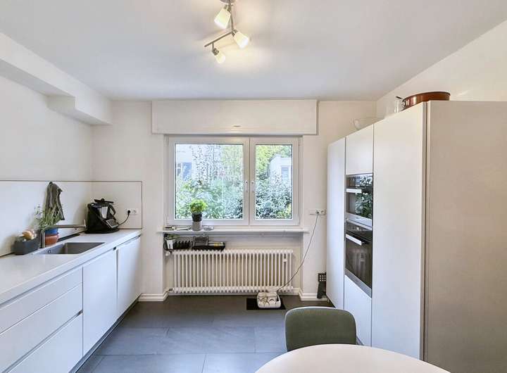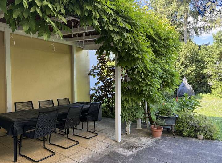Über das zentrale Treppenhaus gelangt man in das Erdgeschoss. Hier öffnet sich ein großzügig geschnittener, offen gestalteter Wohn-/ Essbereich mit direktem Zugang zur Terrasse. Diese ist mit einer charmanten, begrünten Pergola überdacht und führt in den idyllischen Garten. Ebenfalls auf dieser Etage befinden sich ein weiteres Zimmer, das derzeit als Arbeitszimmer genutzt wird, ein Gäste-WC sowie eine geräumige Wohnküche.