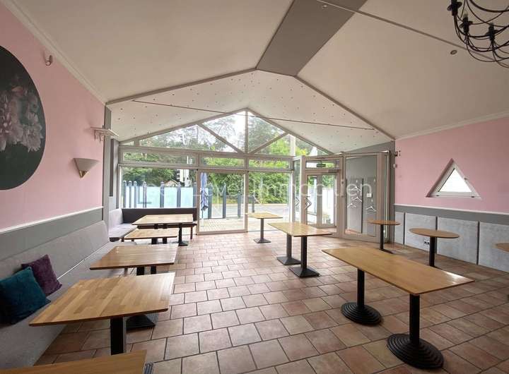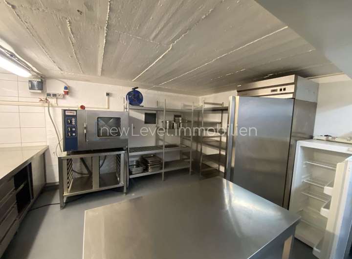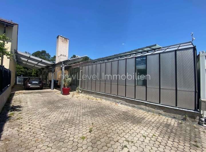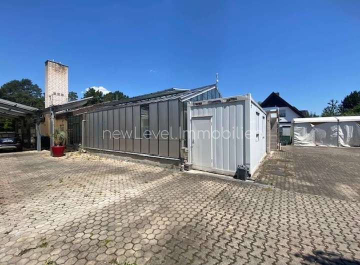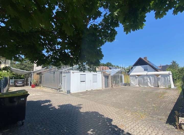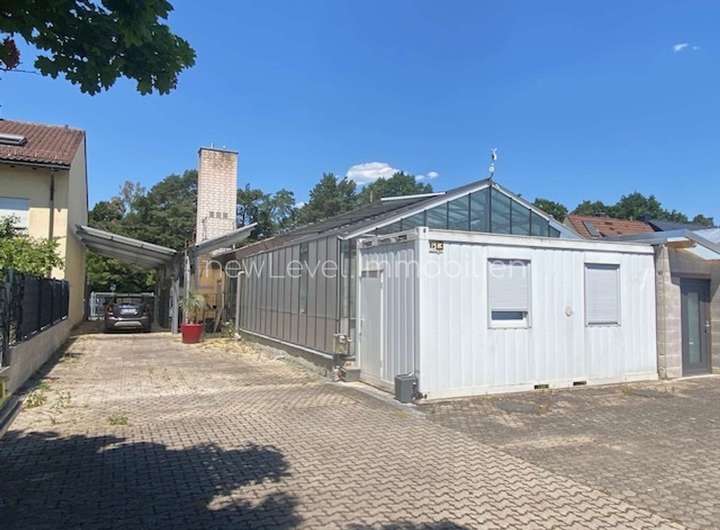 Die aktuelle Bebauung umfasst ca. 390 m² gewerbliche Nutzfläche, aufgeteilt in eine Gastrofläche mit ca. 80m² und angrenzendem ehemaligen ca. 94 m² großen Blumenladen. Dahinter grenzen zwei große Gewächshäuser an mit 90 m² und 120 m² Fläche. In die Bebauung integriert sind zwei Büroräume, sowie Toiletten und Sanitärbereich. Die Gewerbefläche ist teilunterkellert auf ca. 170 m² mit einer Backstube (voll eingerichtet), Lagerräumen sowie Heizung und Haustechnik.