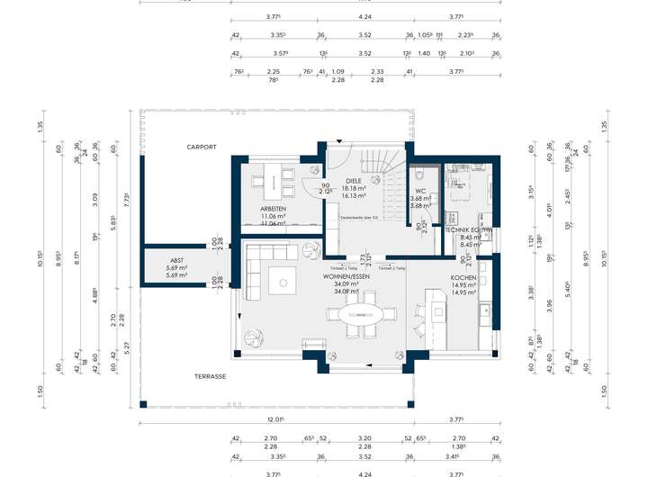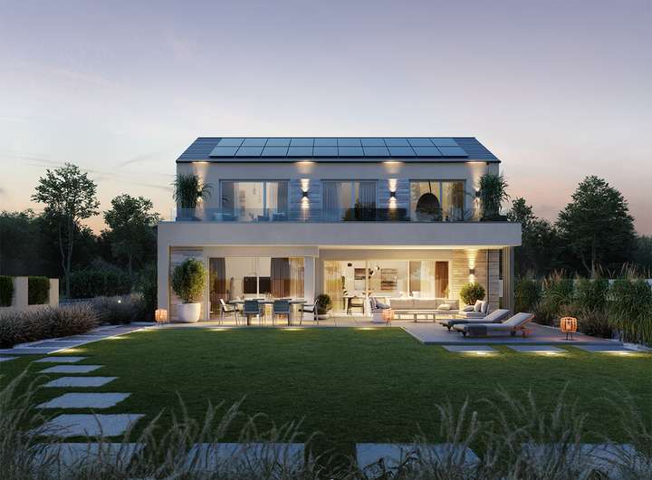 Inklusive dabei ist schon eine PV-Anlage als Voraussetzung zum Null-Eneregiekosten-Haus (9kWp + 10kWh Batteriespeicher), Komfort-Wohnraumlüftung mit Wärmerückgewinnung und konstanter Luftfeuchtigkeit, Fußbodenheizung mit Kühlfunktion, eine hochgedämmte Gebäudehülle mit Thermofundamentplatte, Passivhausfenstern mit hochwertiger Aluminiumschale mit Rollläden und vielem mehr.