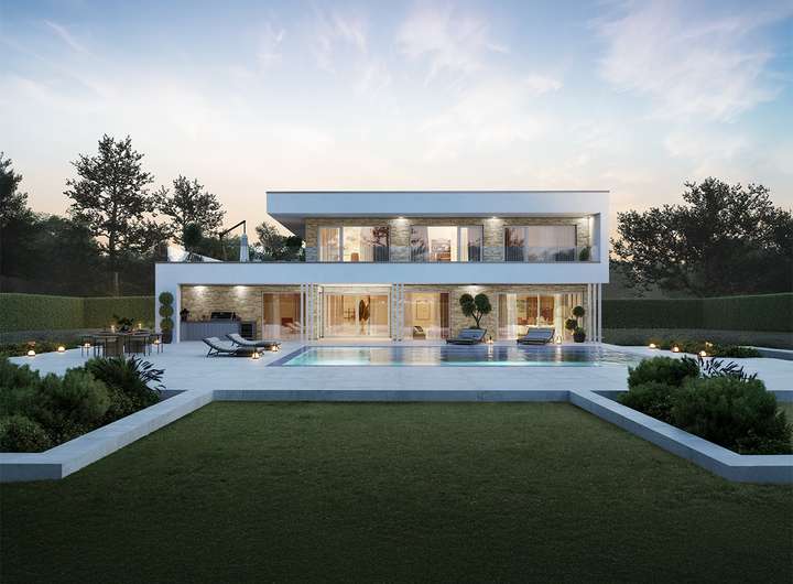 - Wandintegrierte Aluminium-Rollläden oder Raffstore, elektrisch angetrieben mit Smart Home System