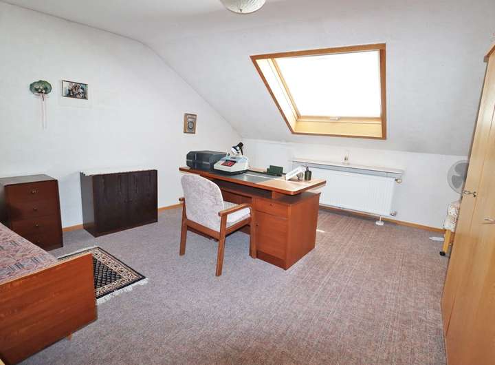 Das Obergeschoss verfügt über einen ähnlichen Grundriss, wobei die Räumlichkeiten hier durch ein zusätzliches Wohnzimmer ergänzt werden. Dazu gehören die Räume im ausgebauten Dachgeschoss. Hier finden Sie zwei Zimmer, die als Kinder-, Arbeits- oder Gästezimmer genutzt werden können, ein weiteres Duschbad sowie einen nicht ausgebauten Speicherraum.