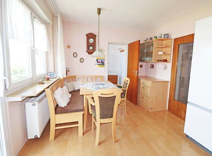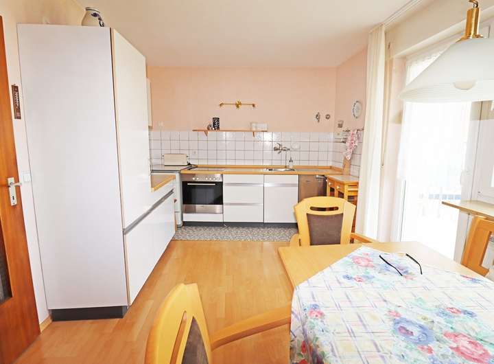 Die Immobilie verfügt im Erdgeschoss über eine große Essküche, die Zugang auf den Balkon bietet und an die ein praktischer Abstellraum angrenzt. Schlafzimmer sowie Duschbad ergänzen die Wohnung. Die Garage ist ins Haus integriert und über das Treppenhaus zugänglich.