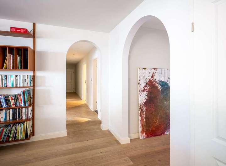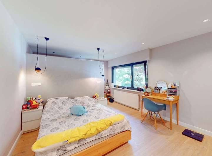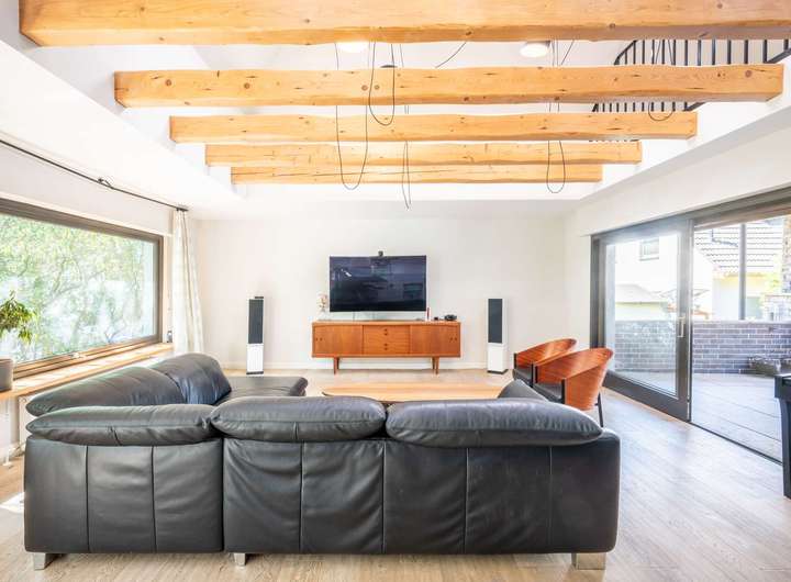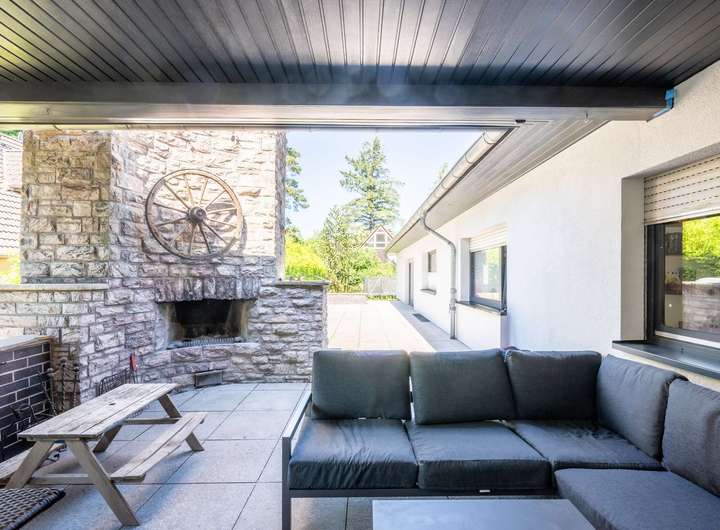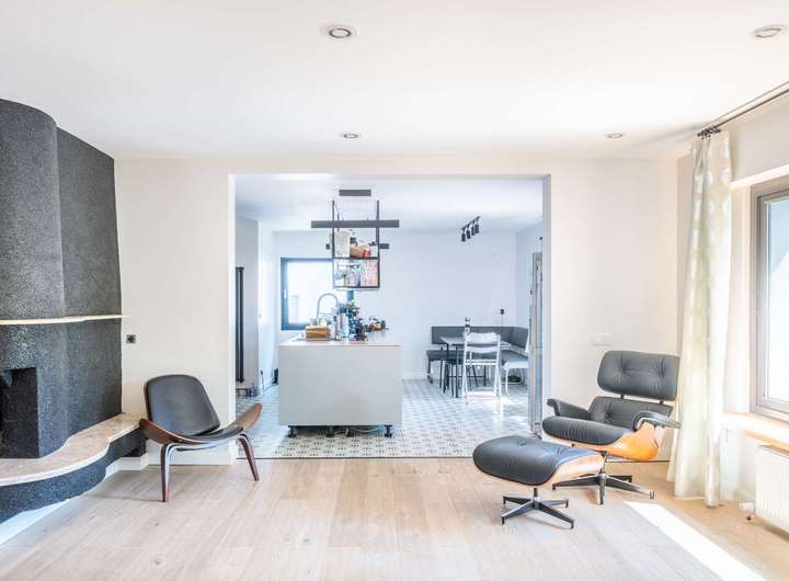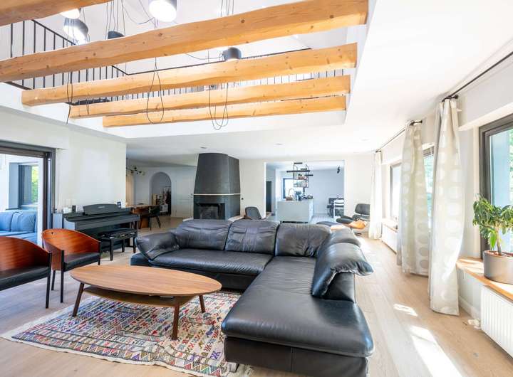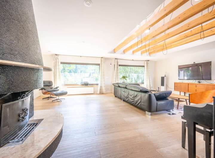 Mit einer Wohnfläche von rund 350 m² bietet die Immobilie insgesamt sieben Wohn- und Schlafzimmer, verteilt auf ein durchdachtes Raumkonzept mit offenem, lichtdurchflutetem Grundriss. Die Ausstattung überzeugt mit hochwertigem Echtholzparkett, doppelt verglasten Holzfenstern, Steinfliesen sowie einem stilvollen Kamin im Wohnbereich, der an kühleren Tagen für eine behagliche Atmosphäre sorgt.