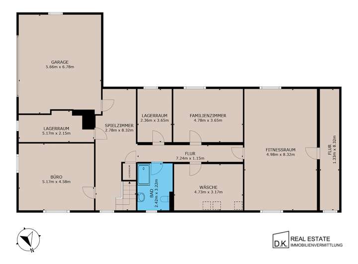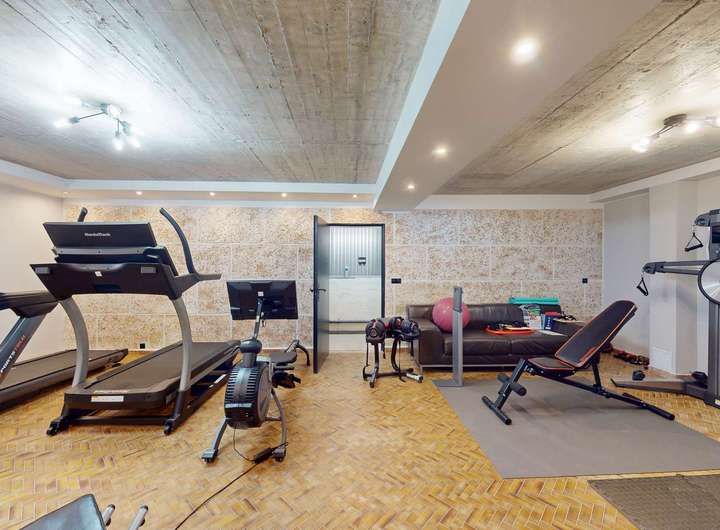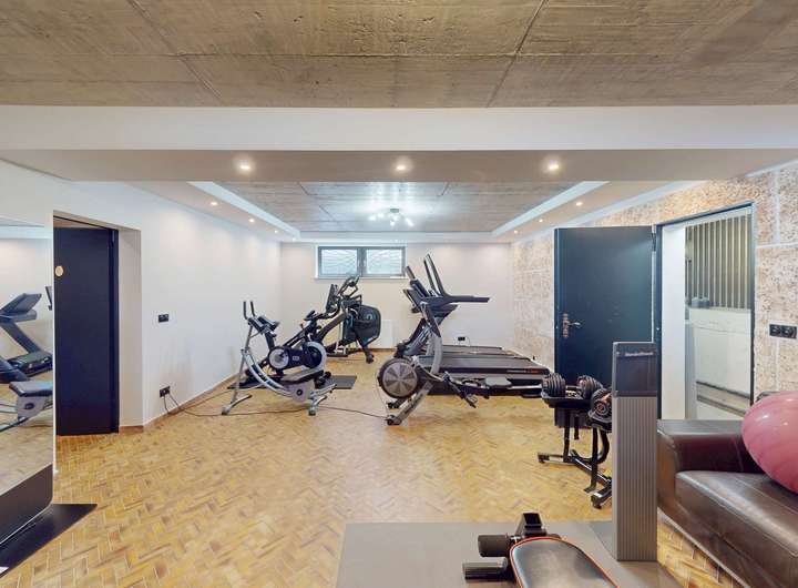 Im vollständig unterkellerten Bereich bietet das Haus neben einem großzügigen Gym-Bereich auch fünf zusätzliche Räume – perfekt nutzbar als Hobby-, Lager- oder Arbeitsflächen. Der Technikbereich sowie ein praktischer Hauswirtschaftsraum ergänzen das Angebot. Die direkt über den Keller begehbare Doppelgarage sorgt für maximalen Komfort im Alltag.