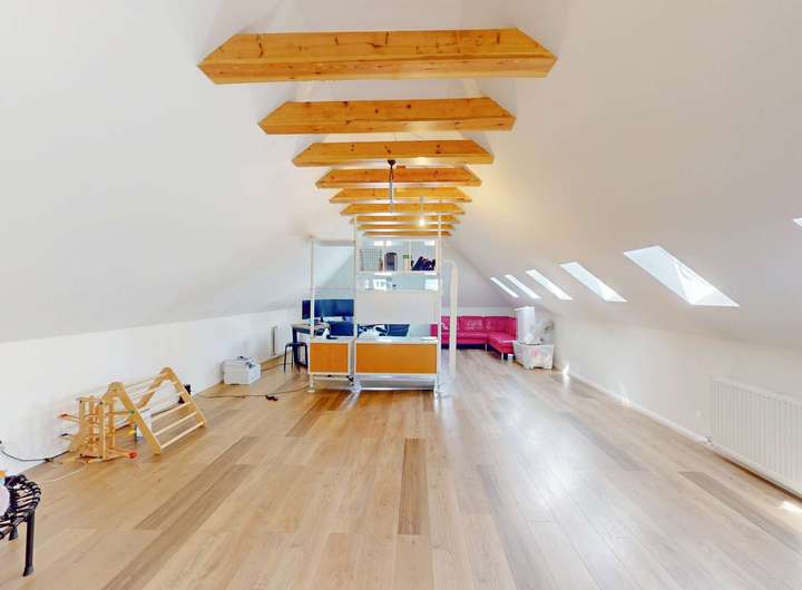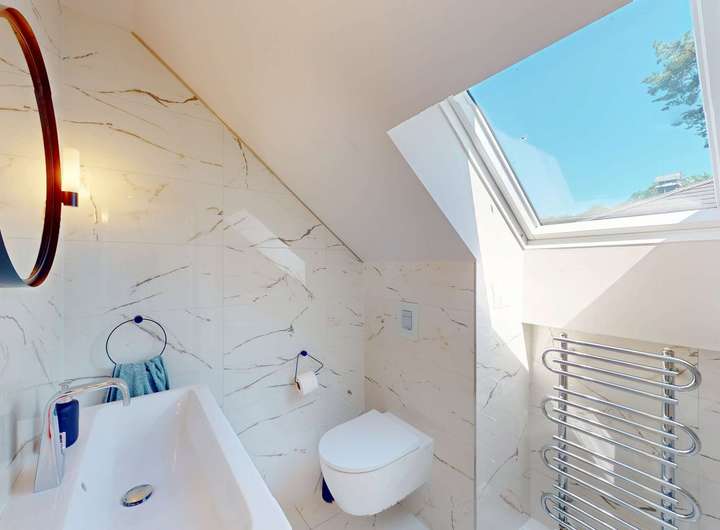 Das ausgebaute Dachgeschoss beherbergt vier vielseitig nutzbare Zimmer sowie eine separate Küche und ein modernes Badezimmer mit Dusche. Diese Etage eignet sich hervorragend für größere Familien, Gäste oder als potenziell abgetrennter Wohnbereich mit eigenem Charakter.