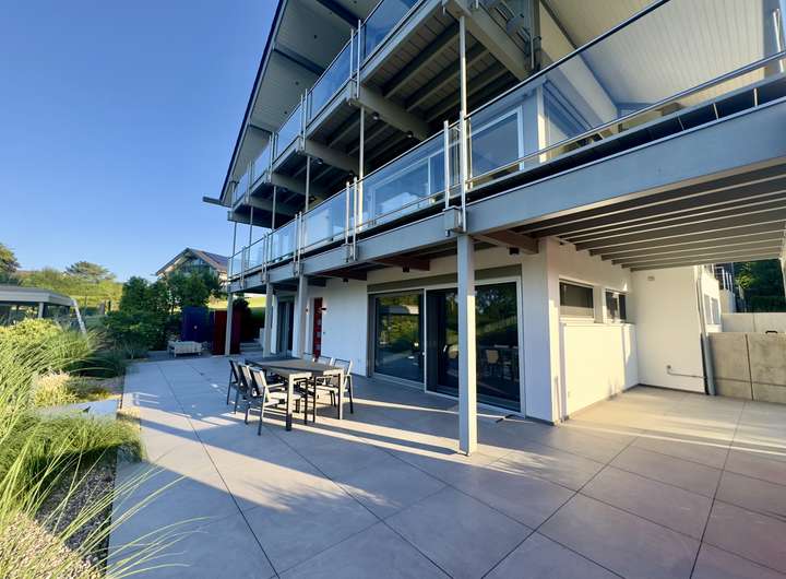 Im Untergeschoss befindet sich eine separat zugängliche Einliegerwohnung mit Schlafzimmer, Wohnbereich samt Küchenzeile der Marke Bulthaup, Bad mit Dusche sowie einer großen Terrasse mit Gartenanschluss.