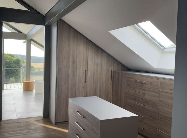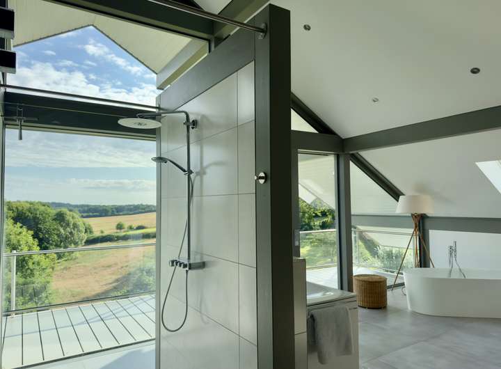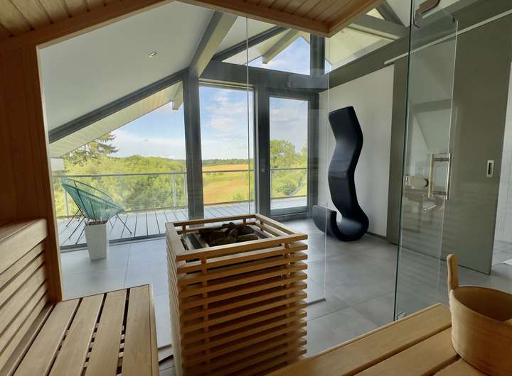 Der private Wellnessbereich im Obergeschoss verfügt über eine Sauna, eine freistehende Badewanne, eine Dusche mit Panoramablick sowie einen direkt angeschlossenen begehbaren Kleiderschrank. Der angrenzende Masterschlafbereich bietet Zugang zu einem durchgehenden Balkon.