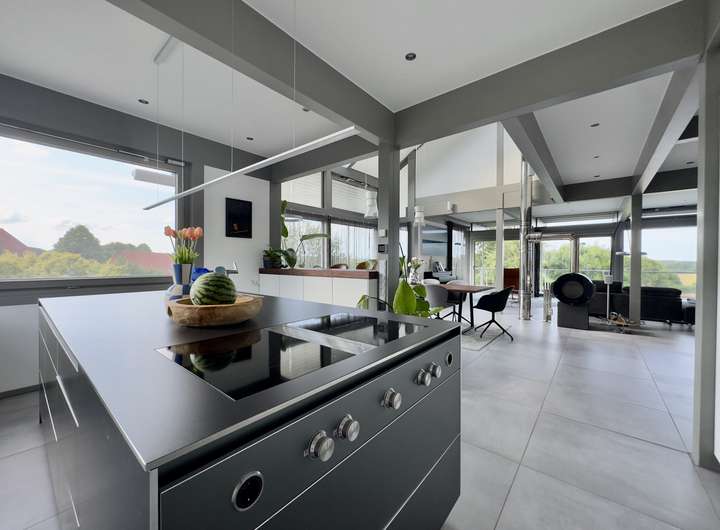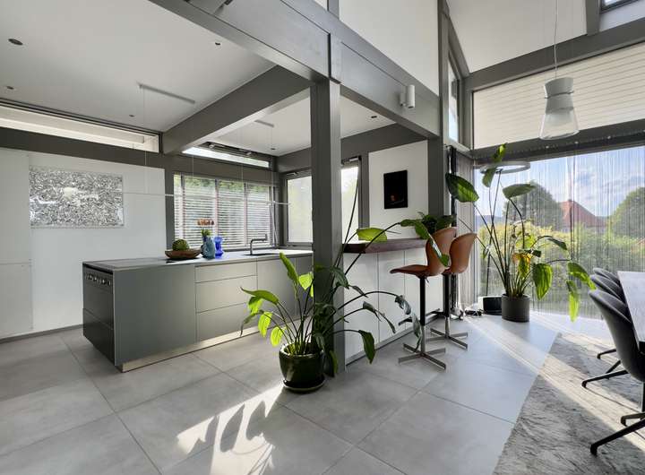 Herzstück des Hauses ist der zentrale Wohnbereich mit Kaminofen der Marke Bullerjan, der wohlige Wärme verbreitet – sogar bis hinauf zur offenen Galerie im Obergeschoss. Die offen gestaltete Bulthaup-Einbauküche mit hochwertigen Elektrogeräten überzeugt sowohl optisch als auch funktional und lässt keine Wünsche offen.