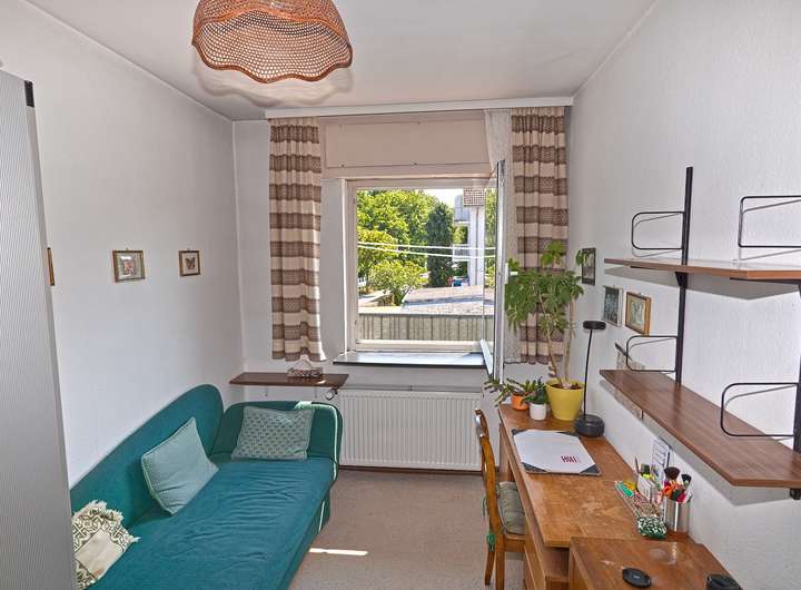 Im ersten Stock befinden sich ein großes und zwei kleinere Zimmer. Von dort aus treten Sie auf einen Balkon mit Südwestausrichtung.