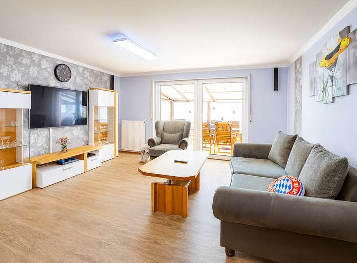 Die vordere Einheit im Erdgeschoss ist über einen eigenen Eingang zugänglich. Sie verfügt über ein helles Wohn- und Esszimmer, ein Schlafzimmer, eine separate Küche, ein Gästezimmer, ein Badezimmer und einen Hauswirtschaftsraum – ideal für Gäste, Verwandte oder zur Vermietung.