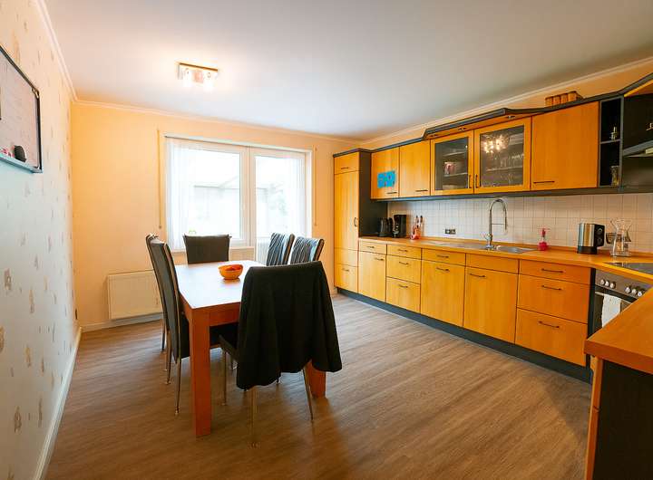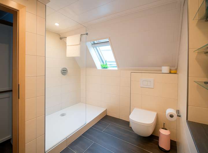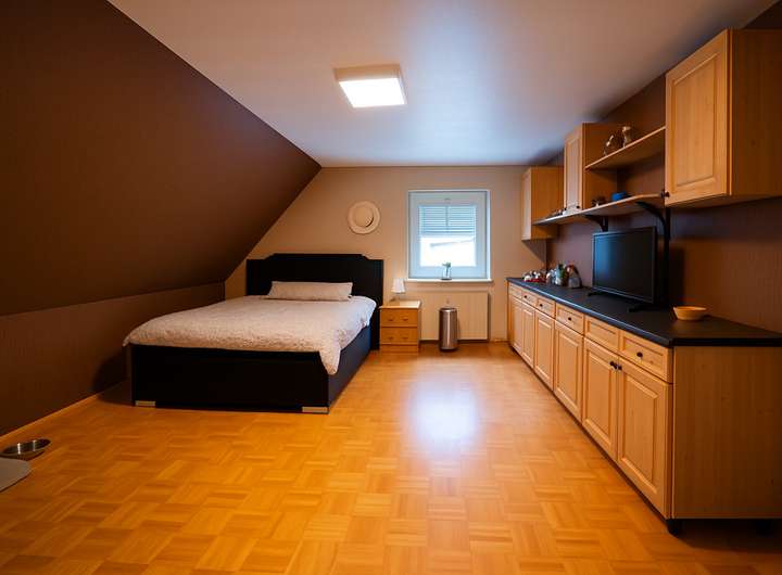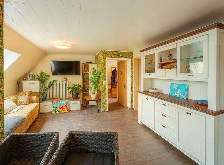 Im Dachgeschoss des vorderen Gebäudeteils befindet sich die dritte Wohnung. Diese bietet ein gemütliches Zimmer, eine Küche mit integriertem Wohn- und Essbereich, ein Badezimmer und einen praktischen Hauswirtschaftsraum. Die charmanten Dachschrägen verleihen den Räumen eine behagliche Atmosphäre.