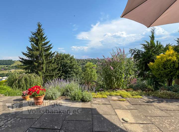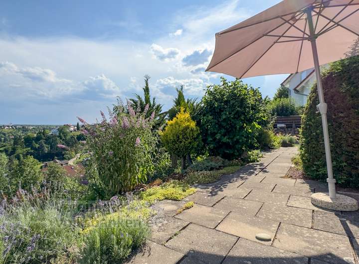 •Großzügige Terrassen und Gärten mit Gartenhütte, Obstbäumen und Sichtschutz