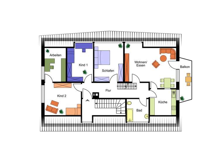 Die beiden Maisonette-Wohnungen verteilen sich auf zwei Ebenen und verfügen über einen großzügigen Wohnbereich mit direktem Zugang zur Terrasse bzw. in den Garten, eine abgeschlossene Küche, Tageslichtbad mit WC, sowie zwei Schlafräume im oberen Bereich. Die Dachgeschosswohnung erreicht man über das gemeinschaftliche Treppenhaus. Sie bietet drei Zimmer, Küche, Bad sowie einen großzügigen Balkon zur Westseite. Zwei außenliegende Räume können bei Bedarf in den Wohnbereich integriert und flexibel genutzt werden. Zum Dachspitz gibt es 2 Zugänge, einmal in zwei ausgebaute Nutzräume und zum anderen in eine Bühnenfläche.