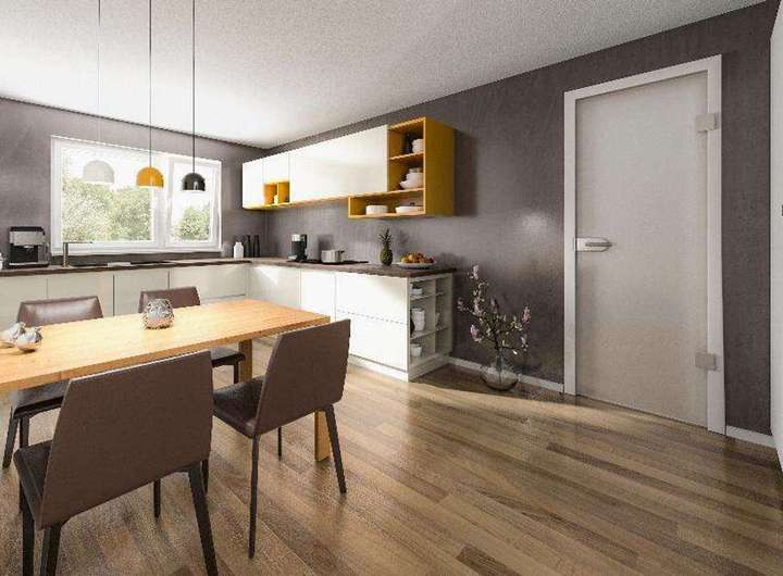 Herzstück des Hauses ist der lichtdurchflutete Wohn- und Essbereich mit offener Küche und direktem Zugang zum Garten. Hier wird gekocht, gespielt, gelacht – ein Ort, an dem sich das Leben abspielt. Der durchdachte Grundriss schafft einen einladenden Eingangsbereich, der Gäste willkommen heißt und Ihnen das gute Gefühl gibt, zu Hause zu sein.