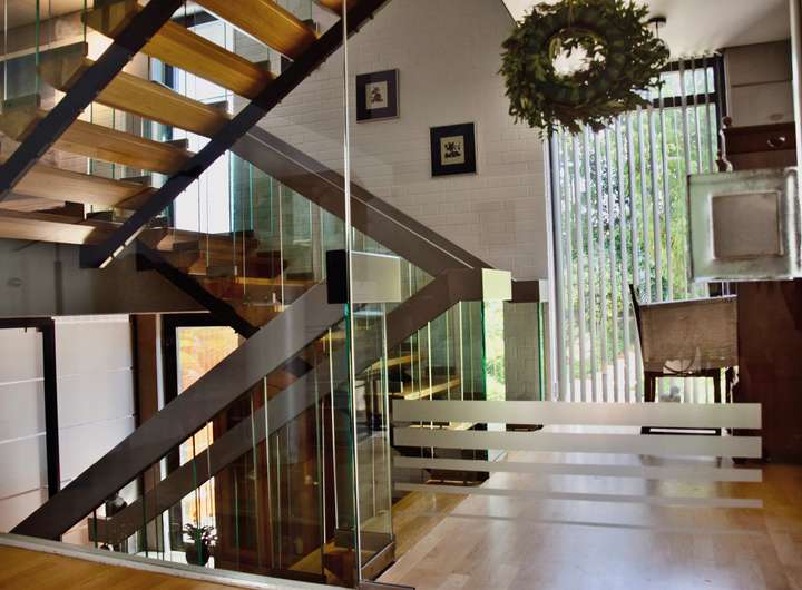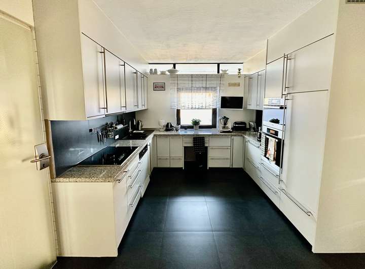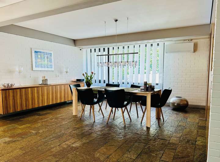 Das Haus verfügt über eine markante Split-Level-Bauweise auf 370 m² Wohnfläche, die großzügige Gemeinschaftsbereiche mit privaten Rückzugsräumen verbindet. Der Eingangsbereich im Erdgeschoss beeindruckt durch eine gläserne Trennwand, die nahtlos in den hellen Essbereich übergeht. Die offene Küche mit Hauswirtschaftsraum bietet direkten Zugang zur Doppelgarage. Zusätzlich stehen Ihnen vier Stellplätze zur Verfügung, was ausreichend Parkmöglichkeiten für Familie, Freunde oder Gäste garantiert.