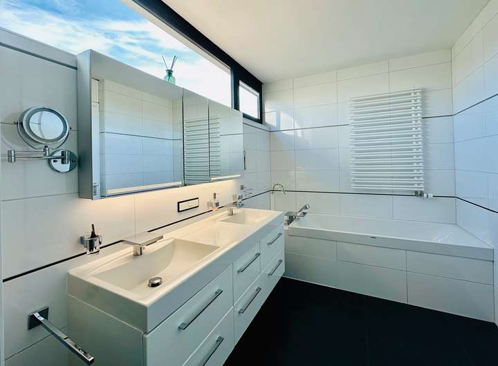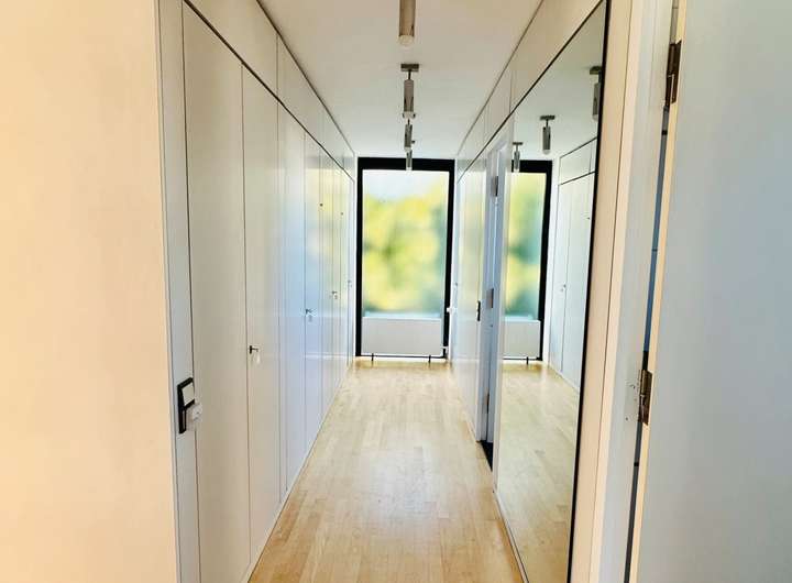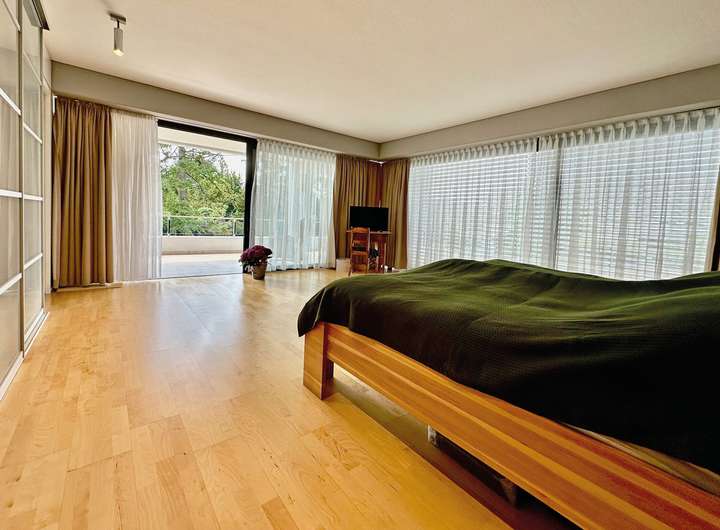 Das Obergeschoss besticht durch ein großzügiges Elternschlafzimmer mit viel natürlichem Licht und Zugang zur überdachten Terrasse mit Südwestausrichtung. Ein luxuriöses Badezimmer sowie eine stilvolle Ankleide mit maßgefertigten Einbauschränken runden den Raum ab.