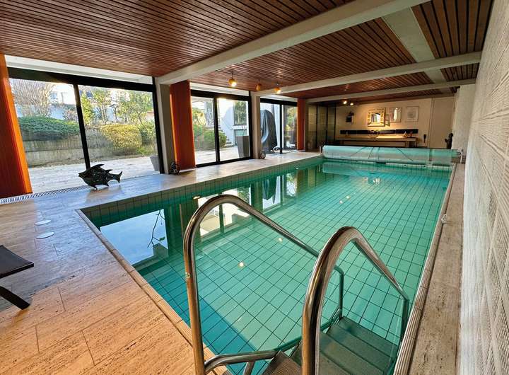 Im Untergeschoss erwartet Sie ein exklusiver Wellnessbereich mit einem 4 x 8 Meter großen Indoor-Pool, ausgestattet mit einer Gegenstromanlage. Ergänzt wird das Angebot durch eine Sauna mit separater Dusche, ein Tauchbecken und eine moderne Wasseraufbereitungsanlage, die für kristallklares Wasser sorgt. Eine Sonnenterrasse, ein Gästezimmer sowie Versorgungs- und Kellerräume bieten zusätzlichen Komfort.