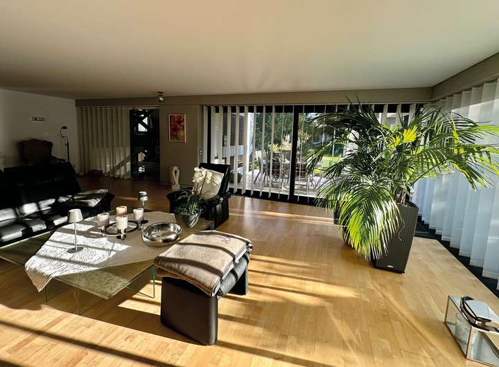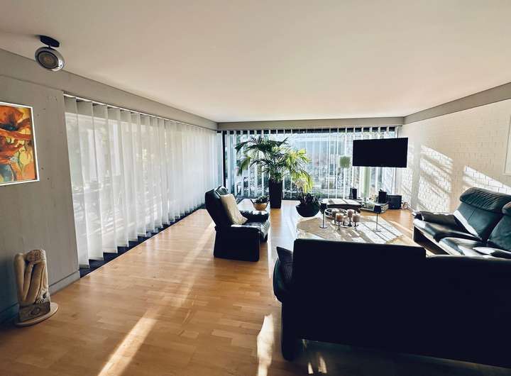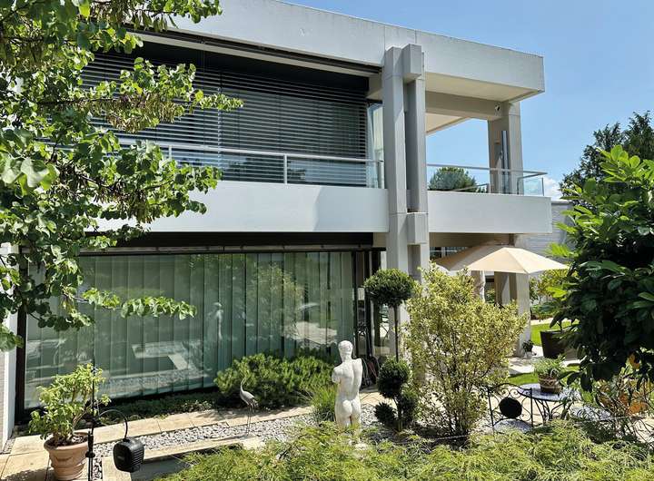 Dieses ikonische, zweigeschossige Anwesen wurde vom renommierten Architekten Gerd Volker Heene, Jahrgangsbester bei Egon Eiermann, einem der bekanntesten Architekten in Deutschland an der Technischen Hochschule in Karlsruhe, entworfen. Es vereint innovative Architektur mit modernem Komfort.