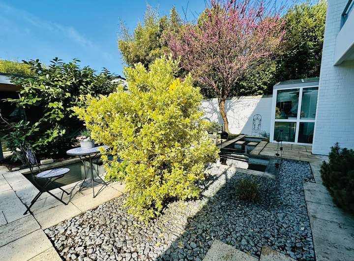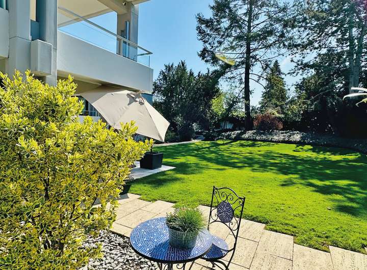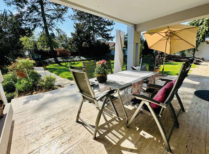 Das ca. 1.200 m² große Grundstück besticht durch einen gepflegten Garten mit altem Baumbestand, einem stilvoll integrierten Teich und mehreren gemütlichen Sitzbereichen. Der weitläufige Rasen lädt zu Freizeitaktivitäten ein, während eine blickgeschützte Sonnenterrasse zum Verweilen einlädt. Der Garten ist ideal für gesellige Abende, Familienzeit oder entspannte Stunden im Grünen.