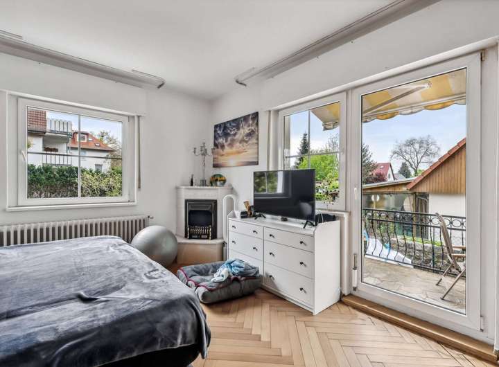 Im Erdgeschoss befinden sich ein großes Wohn- und Esszimmer mit schönem Runderker und Zugang zur Südterrasse, ein weiteres Zimmer, eine praktische Küche mit praktischer Einbauküche mit Essplatz, ein Gäste-WC mit Dusche sowie eine Eingangsdiele mit Abstellbereich. Im Flur führt eine Treppe in das Dachgeschoss und in den Vollkeller.