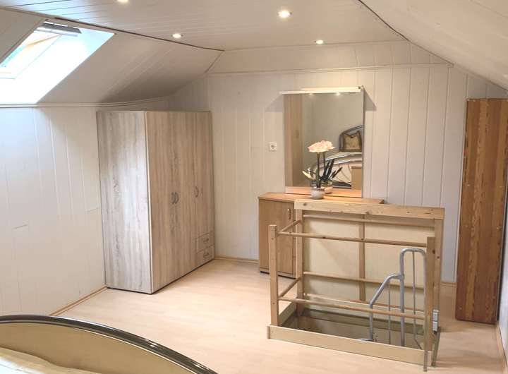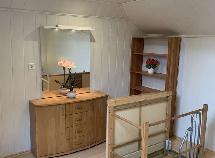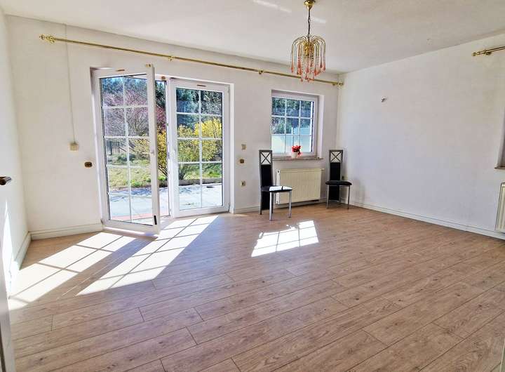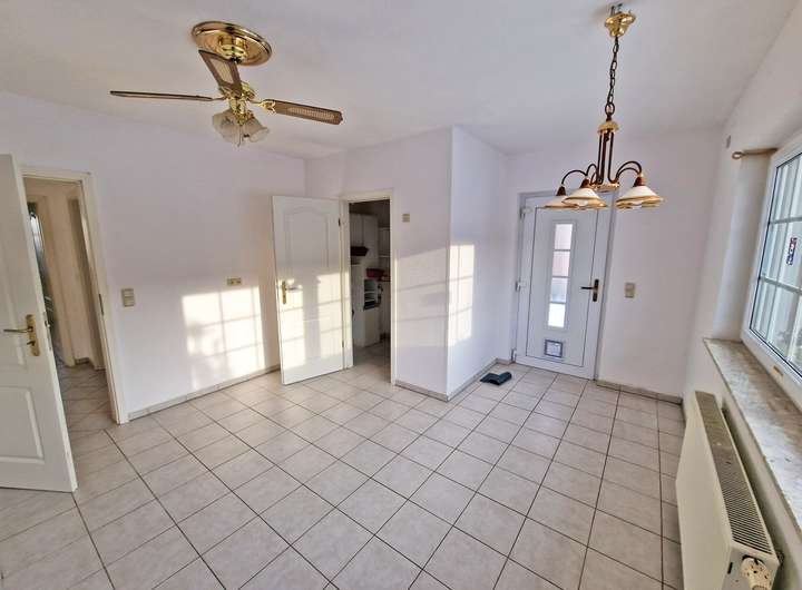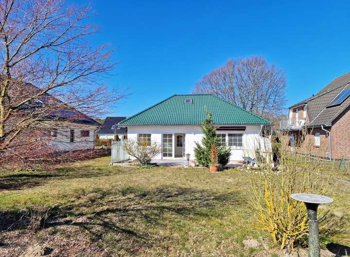 Das Haus wurde im Jahr 2002 massiv, mit ca. 108 m² Wohnfläche im Bungalowstil errichtet. Im Erdgeschoss wurde die Immobilie, vom Flur ausgehend, mit einem großzügigen Wohnzimmer, einer sepraten Küche mit angrenzenden Hauswirtschaftsraum, einem Schlafzimmer, einem Tageslicht-Duschbad und einem Kinderzimmer versehen. Die Räume sind großzügig und hell gestaltet. Die Küche bietet einen direkten Zugang zum Außenbereich. Die große Süd-Terrasse ist vom Wohnzimmer aus begehbar und die vorhanden Markise bietet Ihnen Sonnenschutz. Über eine Raumspartreppe im Flur gelangen Sie in das ausgebaute Dachgeschoss, wo sich ein weiteres Schlafzimmer befindet. Die Dachschrägen verleihen diesem Raum eine gewisse Gemütlichkeit.