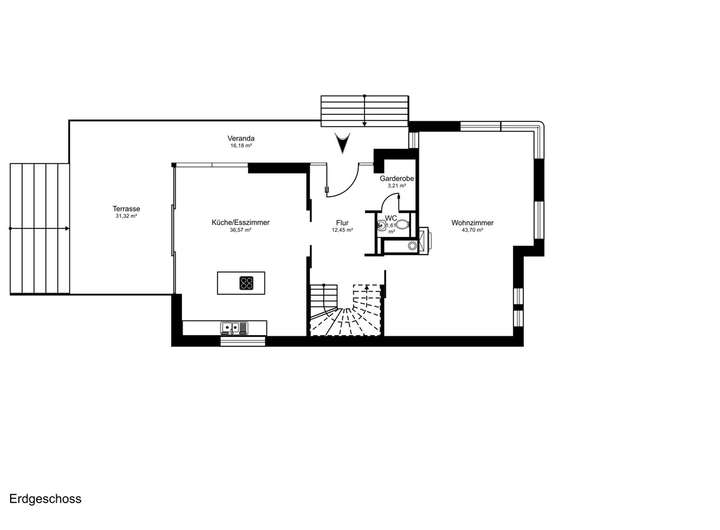 Im Eingangsbereich spüren Sie die einladende und moderne Atmosphäre dieser besonderen Immobilie: ein stilvolles Entree mit einer großzügigen Haustür und einem breiten Flur laden dazu ein, das Haus zu betreten. Der Flurbereich führt in die Wohnküche, das Wohnzimmer sowie zum Treppenhaus. Auch ein Gäste-WC ist im Erdgeschoss zu finden.