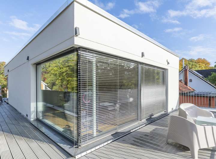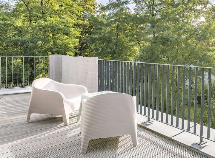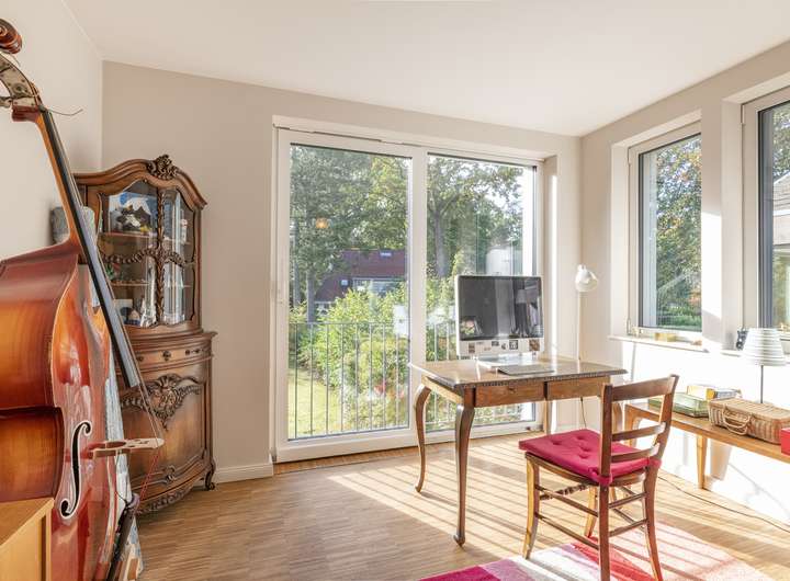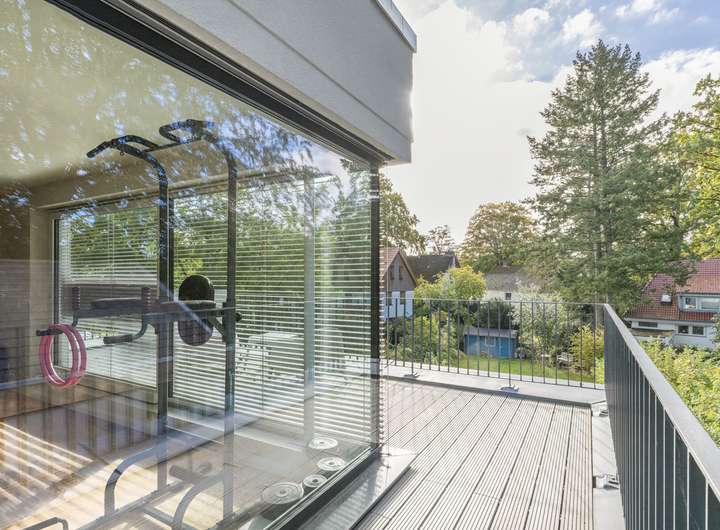 Das Staffelgeschoss beherbergt ein weiteres Arbeitszimmer und ein Gästezimmer mit eigenem Bad. Von der Dachterrasse aus genießen Sie einen wunderbaren Ausblick in die grüne Umgebung.