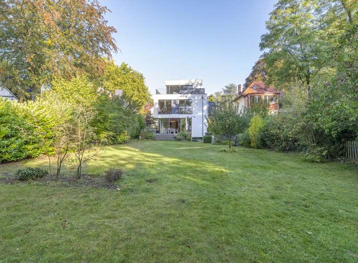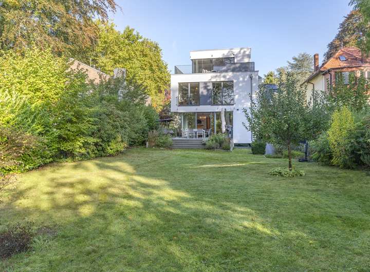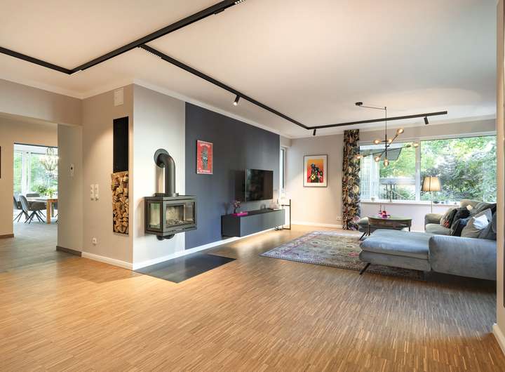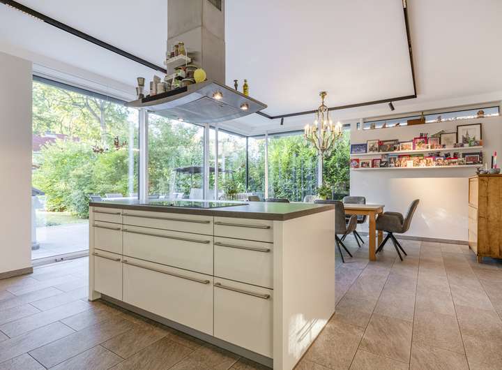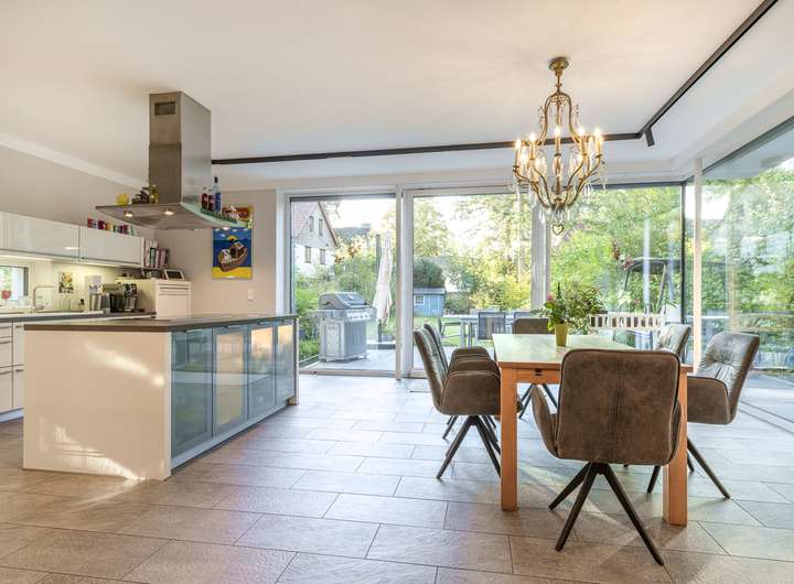 Das Wohnzimmer ist ca. 44 m² groß und mit einem stilvollen Kamin ausgestattet. Ein vorspringender Erkerbereich mit großflächiger Verglasung und bodentiefe Fenster geben diesem Raum einen ganz besonderen Eindruck. Die Wohnküche mit Kochinsel ist ca. 37 m² groß. Die Küchenfronten sind in glanzweiß gehalten und mit hochwertigen Elektrogeräten der Marke NEFF ausgestattet. Der Essbereich bietet 8-10 Gästen ausreichend Platz. Aus der Wohnküche haben Sie durch die bodentiefen Fenster und die Terrassentür Zugang und einen herrlichen Ausblick in Ihren sonnigen Garten. Die Außenterrasse bietet genug Platz für einen großen Tisch, die Grillstation und eine Hollywoodschaukel.
