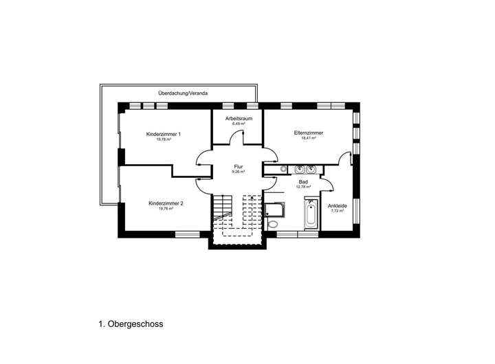 Im Obergeschoss befinden sich zwei großzügige Kinderzimmer, ein Elternschlafzimmer mit angrenzender Ankleide sowie ein modernes Badezimmer. Ein zusätzlicher Arbeitsraum bietet Platz für Homeoffice oder kreative Projekte.