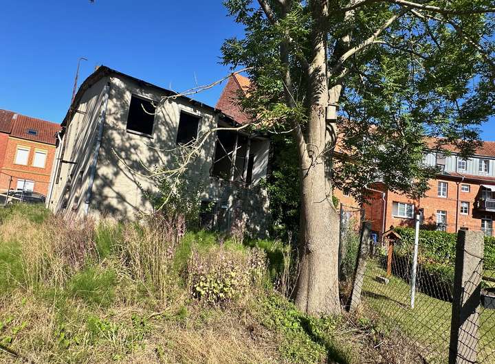 Das Grundstück hat eine markante, dreieckige Form und liegt in einem gewachsenen Wohngebiet mit guter Anbindung. Aktuell befindet sich darauf die Ruine eines alten Gebäudes mit Backsteinfassade, welche im Rahmen eines genehmigten Projekts vollständig abgerissen oder saniert werden kann.