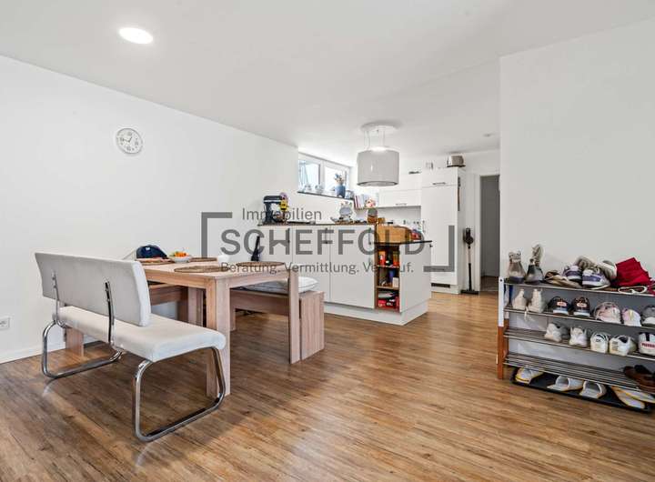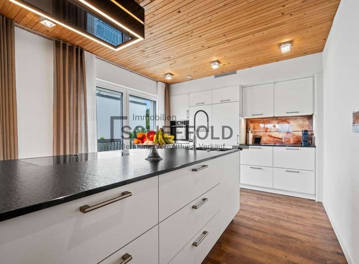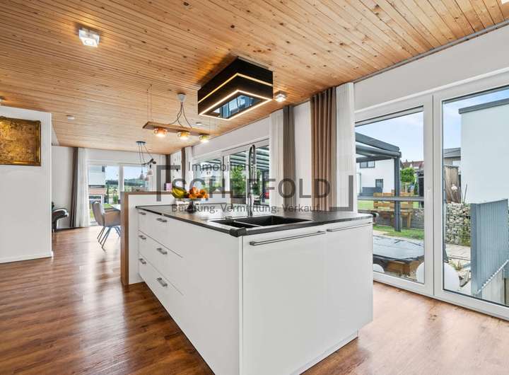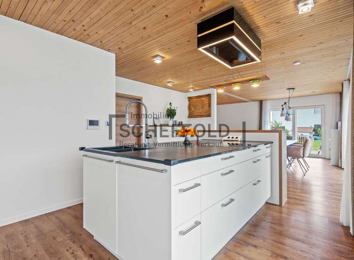 Die offen integrierte Küche ist ein echtes Highlight: modern, hochwertig und mit einer attraktiven Kücheninsel ausgestattet, bietet sie nicht nur Stauraum und Funktionalität, sondern wird zum kommunikativen Mittelpunkt des Familienlebens. Hier trifft Design auf Alltagstauglichkeit – ideal für alle, die gerne kochen und genießen.