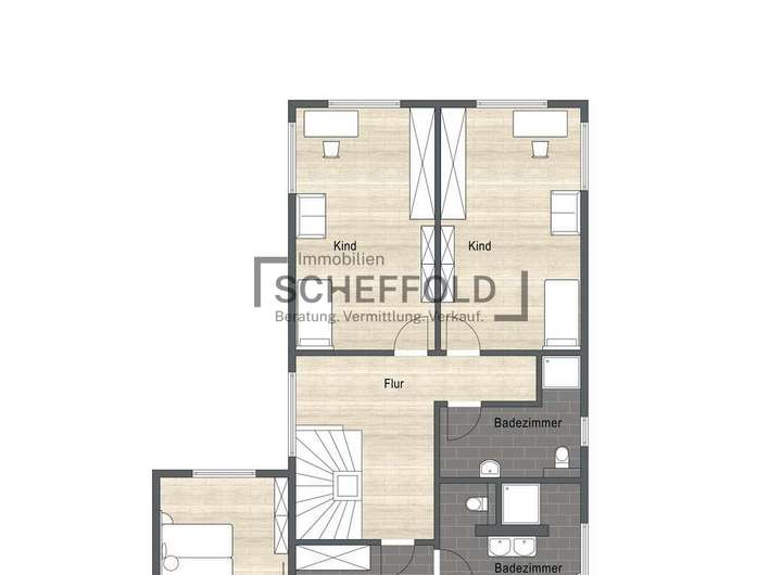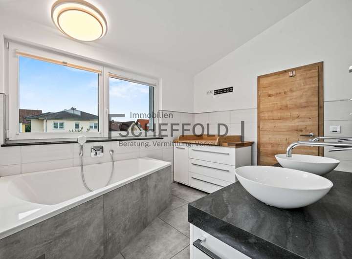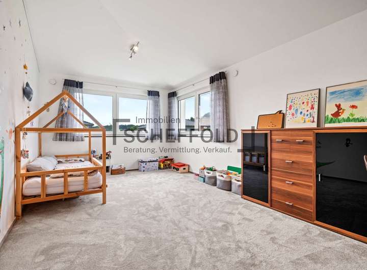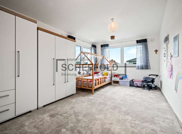 Über eine moderne Holztreppe gelangen Sie in das Obergeschoss, das ebenfalls mit einer durchdachten Raumaufteilung begeistert. Zwei helle und gut möblierbare Kinderzimmer bieten Platz zum Spielen, Lernen und Träumen. Das moderne Kinderbadezimmer ist mit Dusche, WC und Waschbecken ausgestattet – funktional und geschmackvoll zugleich. Das großzügige Elternschlafzimmer mit angrenzendem Ankleidezimmer und eigenem, hochwertigem Bad wird zur privaten Wohlfühloase. Eine elegante Badewanne, eine separate Dusche, Doppelwaschbecken sowie ein WC bieten hier Komfort auf hohem Niveau.
