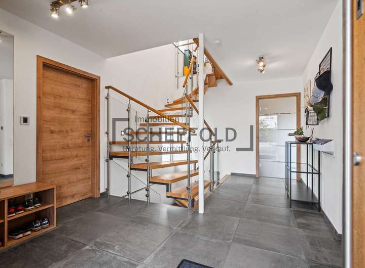 Bereits beim Betreten des im Jahr 2017 erbauten Hauses spüren Sie: Hier wurde mit Liebe zum Detail geplant und gebaut. Ein großzügiger, einladender Flur heißt Sie willkommen und bietet nicht nur ausreichend Raum für Garderobe und Stauraum, sondern vermittelt dank seiner klaren Linien und warmen Materialien sofort ein Gefühl von Zuhause. Von hier aus gelangen Sie in alle Räumlichkeiten des Erdgeschosses – strukturiert und dennoch offen in der Wirkung.