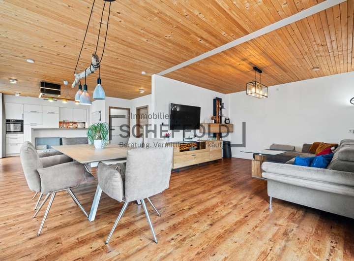 Der lichtdurchflutete Wohn- und Essbereich stellt das Herzstück der Hauptwohnung dar. Mit seiner großzügigen Gestaltung, der modernen Ausstattung und dem durchdachten Schnitt lädt dieser Raum zum Leben, Genießen und Entspannen ein. Große Fensterflächen lassen viel Tageslicht herein und öffnen den Blick auf die teils überdachte Terrasse, die sich harmonisch an zwei Seiten um den Wohnbereich zieht – perfekt für gemütliche Abende, Familienfeste oder einfach ein Frühstück im Freien mit Blick ins Grüne.